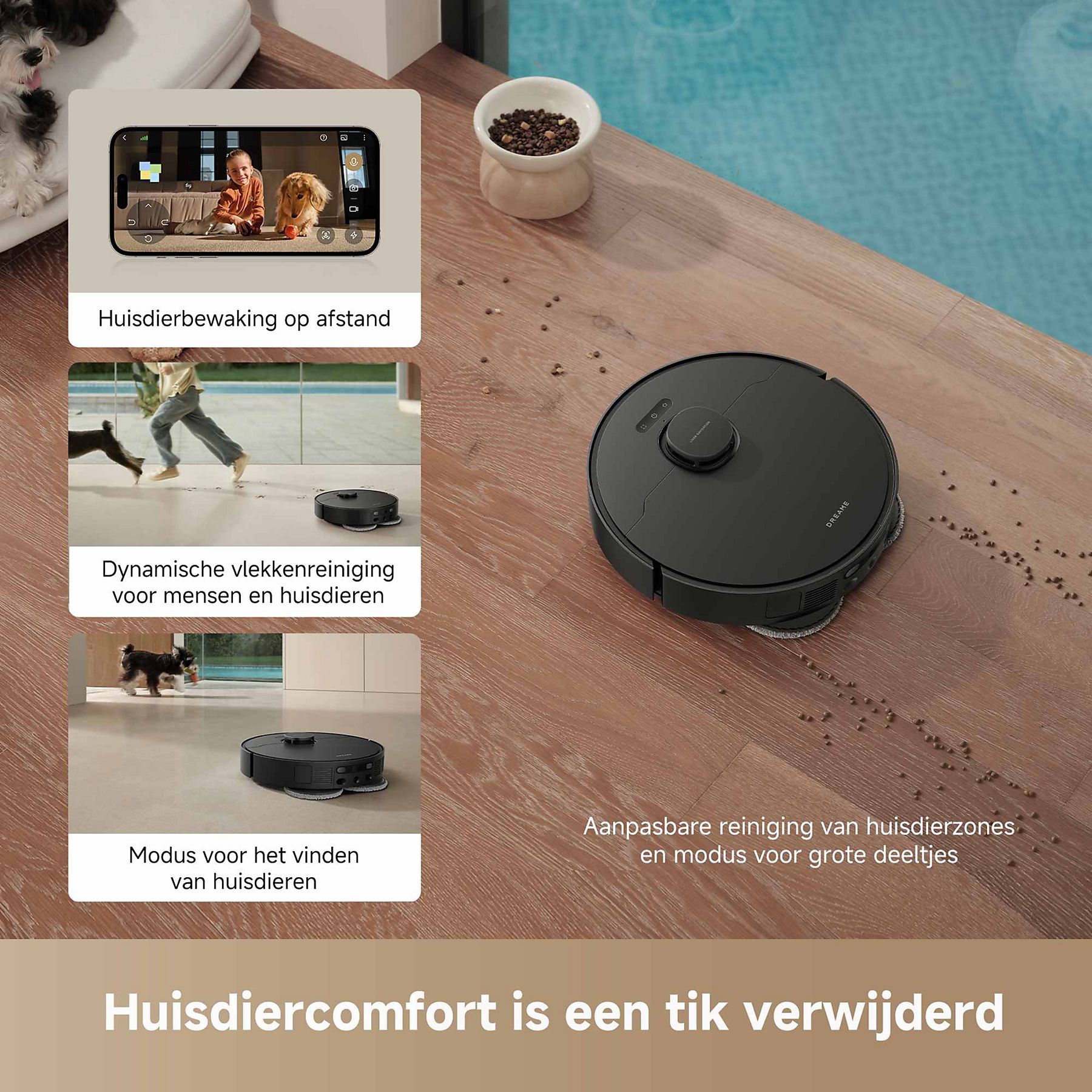 Dankzij LIDAR- en AI-navigatie herkent de robot obstakels zoals kabels en meubels, en plant hij efficiënte schoonmaakroutes. Verder stelt de 3D-gestructureerde lichttechnologie de robotstofzuiger in staat om meer dan 120 soorten objecten te herkennen en te vermijden, wat zorgt voor een nauwkeurige en veilige schoonmaakervaring. Daarnaast is hij compatibel met spraakassistenten zoals Alexa, Google Assistant en Siri, waardoor je hem eenvoudig met je stem kunt bedienen. Via de Dreamehome-app is het tot slot mogelijk om no-go zones in te stellen, de zuigkracht aan te passen en de schoonmaak verder naar wens te personaliseren.