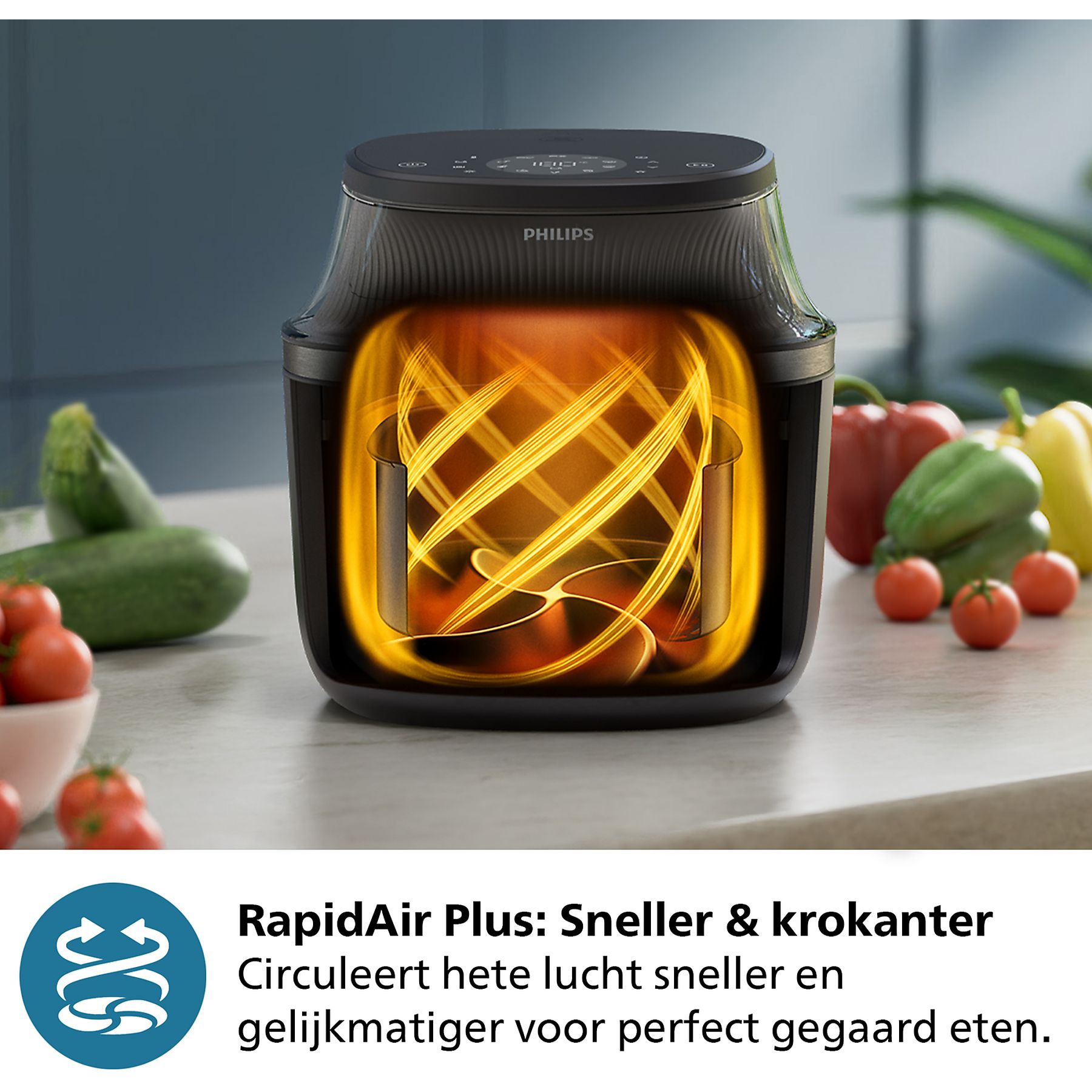 Een Philips airfryer met oranje pijlen binnenin, omringd door tomaten, courgettes en paprika's op een aanrecht.