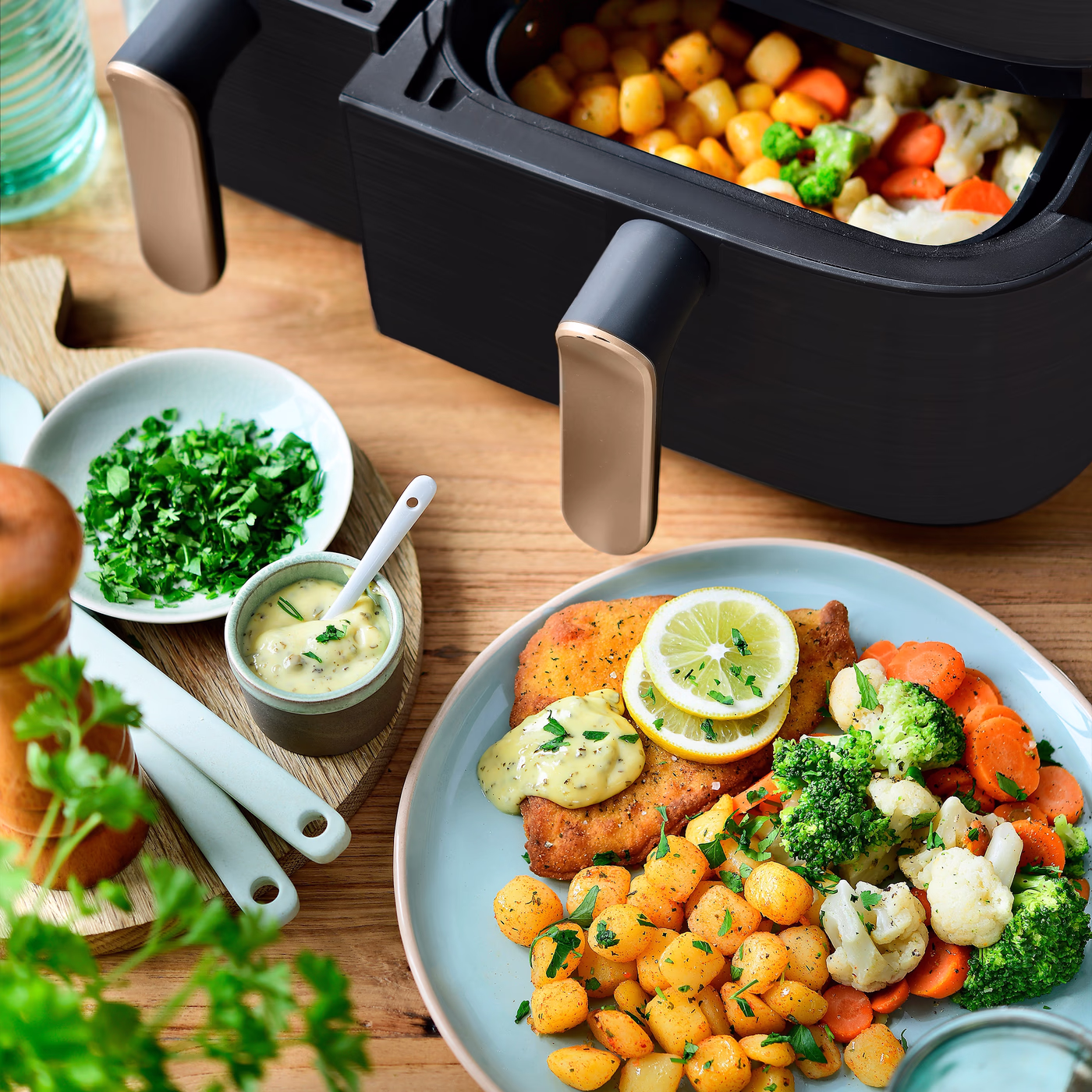 Met de Philips Airfryer 5000 Series Dual Basket NA552/00 bereid je eenvoudig een gezonde maaltijd dankzij de 2 verschillende verwarmingsfuncties. Met de stoomfunctie behoud je de vitamines en mineralen van je gerecht beter. Daarnaast kun je frituren met hete lucht. Zo bereid je bijvoorbeeld een gezonde zalm met knapperig vel zonder een pan te gebruiken. Dankzij de 2 laden kunt u verschillende ingrediënten tegelijkertijd bereiden. Dat is handig wanneer u eten klaarmaakt voor het hele gezin. De Rapid Air Plus-technologie verdeelt de warmte goed door de hele airfryer. Daardoor wordt uw bereiding snel en gelijkmatig van alle kanten en zelfs van binnenuit gaar. U hoeft bijvoorbeeld uw vlees minder vaak om te draaien. Met de sync-functie zijn uw ingrediënten ook tegelijkertijd gaar.
