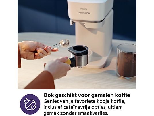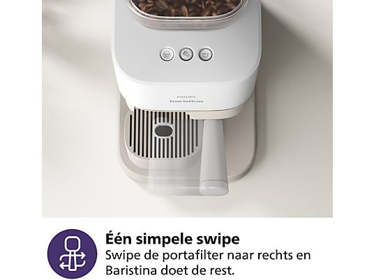 Makkelijker wordt het niet Lekkere koffie van versgemalen bonen zonder ingewikkeld gedoe: daar draait het om bij de Philips Baristina. Het apparaat werkt heel eenvoudig. Je vult de koffiecontainer met de bonen die jij lekker vindt. Vervolgens kies je met de knoppen wat voor koffie je wilt zetten: ga je voor een espresso of lungo? En dan heb je nog maar één stap te gaan: het portafilter naar rechts swipen. Hiermee activeer je het zetproces. De rest doet de machine helemaal zelf: je koffiebonen worden automatisch gemalen, het maalsel wordt aangestampt in het portafilter en je koffie wordt gezet. Makkelijk, toch?