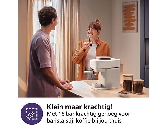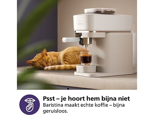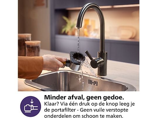 Lekker praktisch Bij veel andere machines is het legen van het portafilter nogal een geknoei. Niet bij de Baristina van Philips: met één druk op de knop komt het koffiedik los! Daarna spoel je het filter gewoon af onder de kraan of veeg je het schoon met een doek. Eenvoudige reiniging dus! Bovendien pak je ’s ochtends met een gerust hart koffie terwijl de rest van het huis nog slaapt. Deze espressomachine doet z’n werk namelijk zo stil dat je ‘m bijna niet hoort. En dankzij z’n compacte formaat vind je altijd wel een plekje voor dit koffiezetapparaat op je aanrecht. Handig!